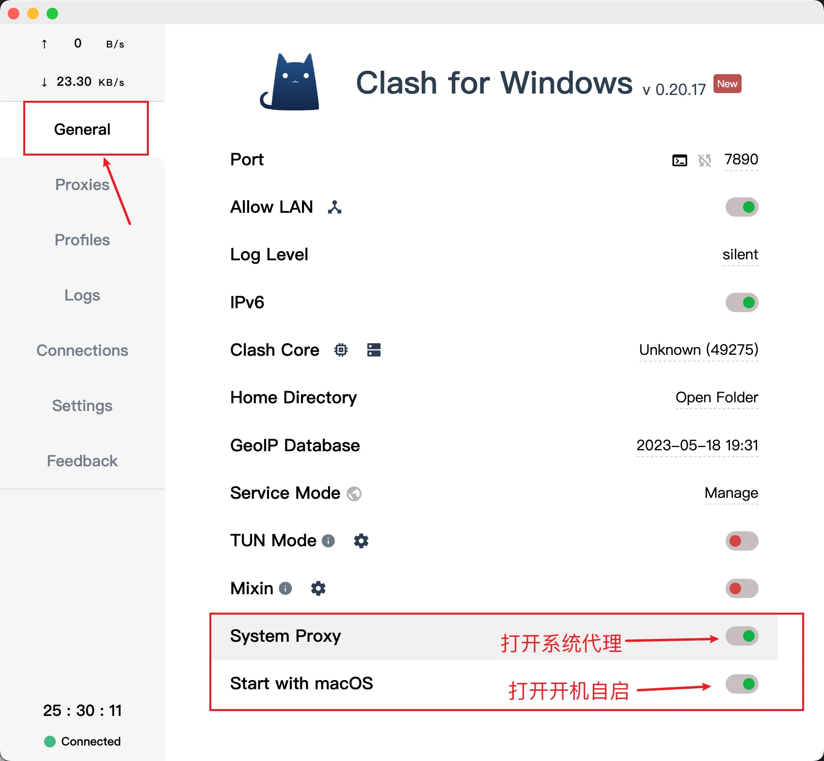 第四步:打开代理开关:到clash for windows 首页,打开【系统代理】/【System Proxy】,打开【开机自启】/【Start with Start with Windows】,即可使用。这是开关 ,后续需要关闭就关这。