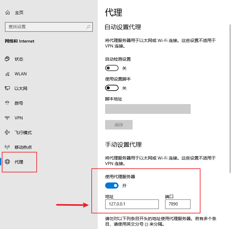 6.检查是否开启系统代理,开启了的话检查是否开启成功。开启系统代理成功了是下面这样的,win10为例子:任务栏设置-网络和internet-代理-手动设置代理-使用代理服务器是打开的-地址是127.0.0.1,端口是7890