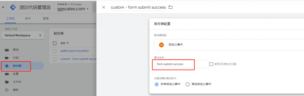 我们只获取wpcf7mailsent发送成功的数据,通过自定义代码来跟踪监听; 在GTM中新建代码并设置在所有网页触发: