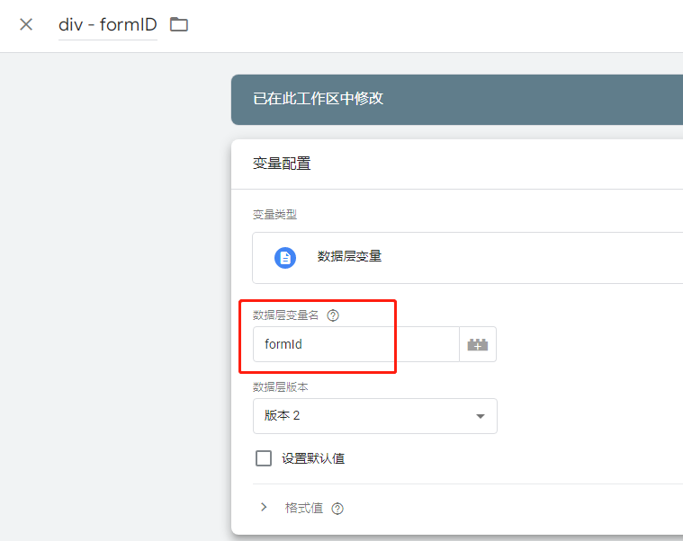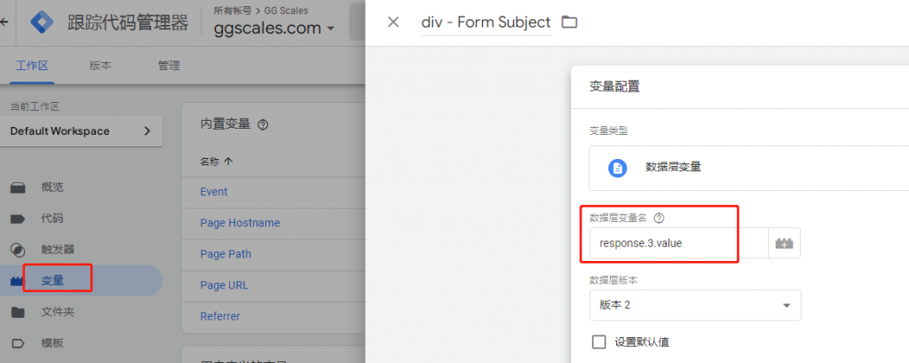 搭建2个名为 “div - formID” 和 “div - Form Subject” 的变量,数据层变量名设置为 “formId” 和 “response.3.value” ,目的是为了提取表单ID和表单第4行的内容。