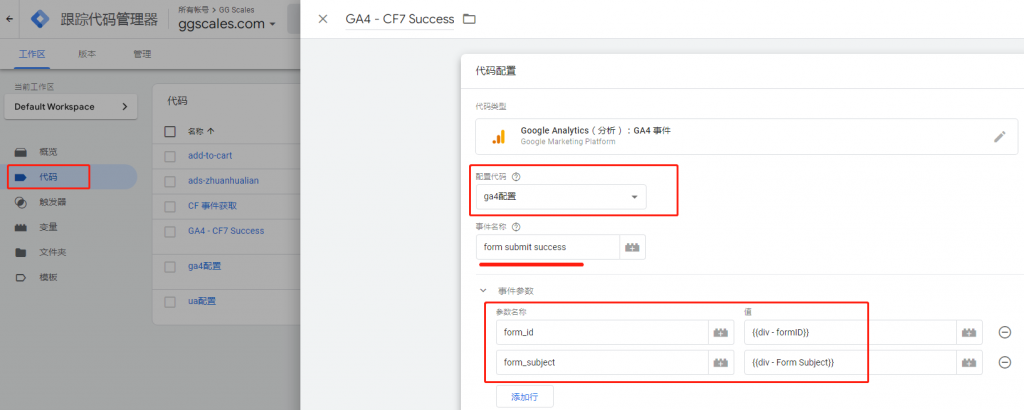 在代码中搭建一个名为 “GA4 - CF7 Success” 的GA4事件; 如果没有配置GA4代码,需要先配置,事件名称可以自定义自己喜欢的,我们这里命名为 “form submit success” ;