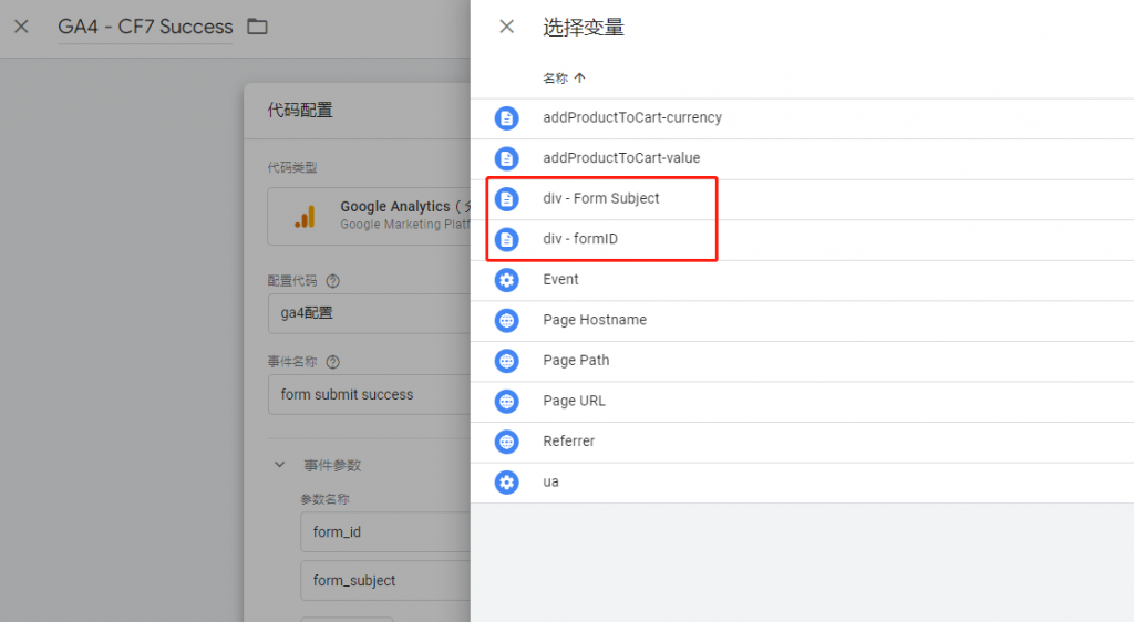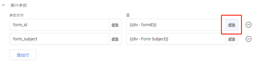 新建2个名为 “form_id” 和 “form_subject” 的事件参数,值选择我们刚才建的两个变量;