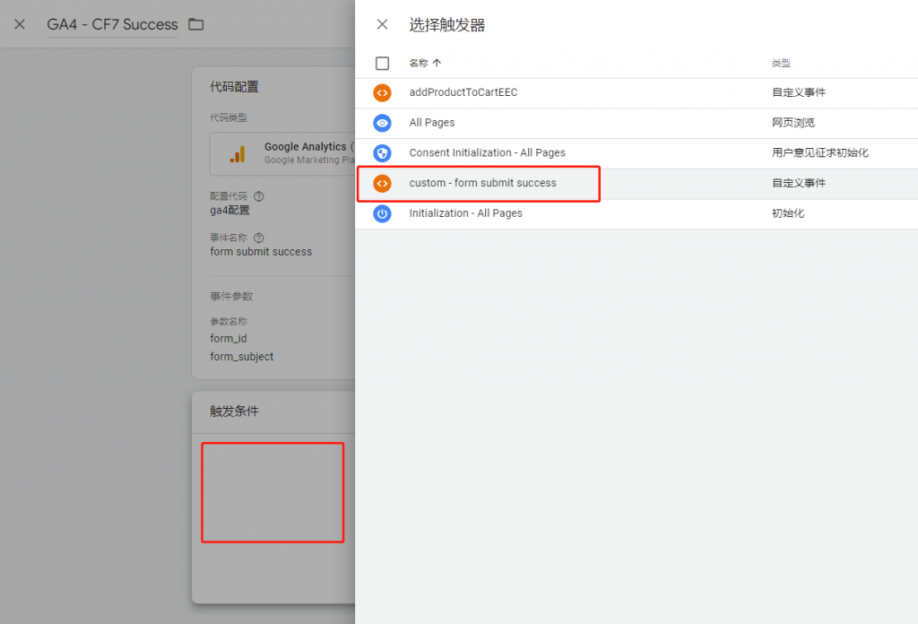 触发条件选择刚才创建的 “custom - form submit success” 触发器;