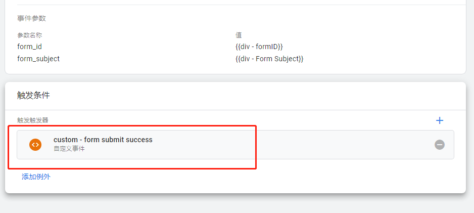 搭建1个触发器和2个变量 搭建一个名为“custom - form submit success”的触发器,事件名称设置为“form submit success”,因为我们在上一步获取C7数据的自定义代码里设置的名称为这个。