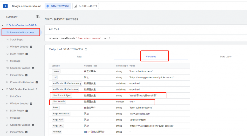 保存后在右上角预览(gtm_debug)模式下提交一个表单看下设置是否生效; 生效左边会显示 “form submit success” 操作,变量也都会显示;