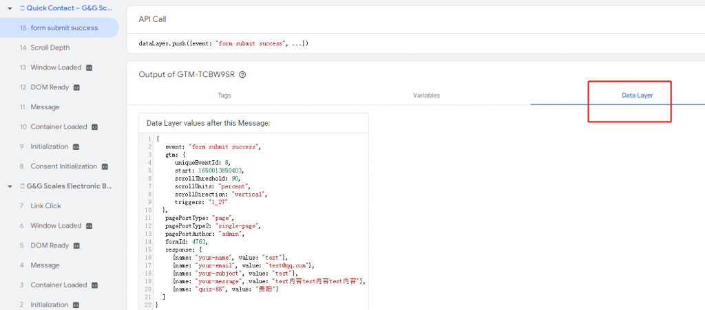 可以在数据层看到事件各项参数,这边也可以理解为什么 “div - Form Subject” 变量的数据层名称设置为 “response.3.value” ,获取的是表单第4行的内容,或者使用Datalayer Checker插件查看更加直观;