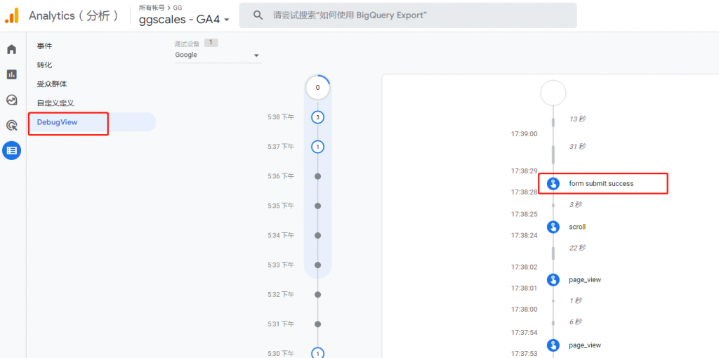 以上测试成功后,在右上角“提交-发布”,发布后再次回到GTM里点击“预览”; 并打开谷歌分析GA4,左边 “配置”,到 “DebugView” 里; 在预览模式下打开网站,提交一个表单,时间戳中会看到 “form submit success” 这个事件操作;