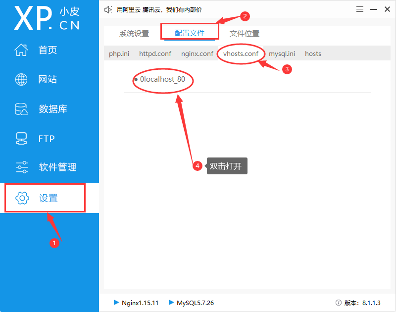 找到设置选项-配置文件-vhosts.conf,点击下面的配置文件0localhost_80