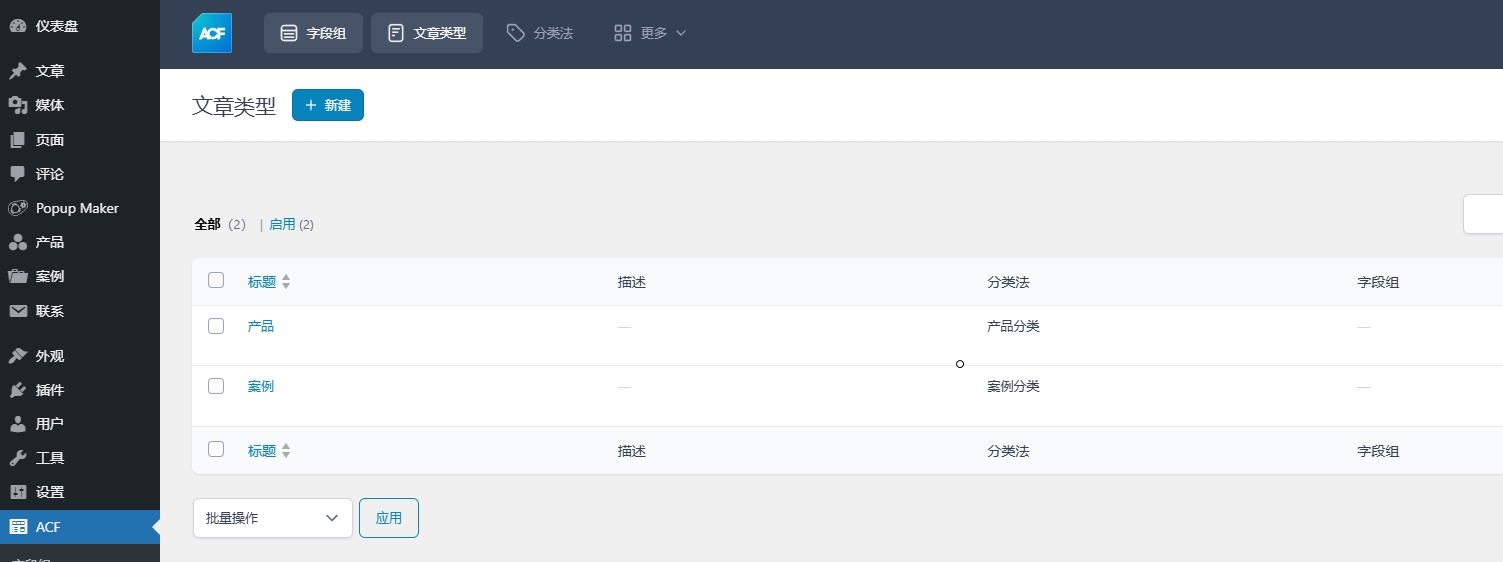 【高级自定义字段 ACF】使用强大、专业和直观的字段自定义WordPress。该插件可创建自定义的文章类型、字段组、分类伐,是实现自定义“产品、案例、项目”分组的最好用的插件(目前WordPress官方与这个插件在打官司,WordPress出了仿制该插件的”SCF-安全自定义字段“,对比原版,仿制版的基本功能都有,但缺少多图上传等高级功能)