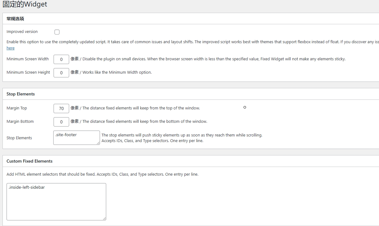 该插件也叫作固定的widget,使用 fixed widget小工具插件来创建粘性窗口小工具,这些页面在向上或向下滚动页面时会停留在可见的屏幕区域中,从而提高转化率。可设置固定元素离顶部多少像素,遇到底部那个元素停止固定。