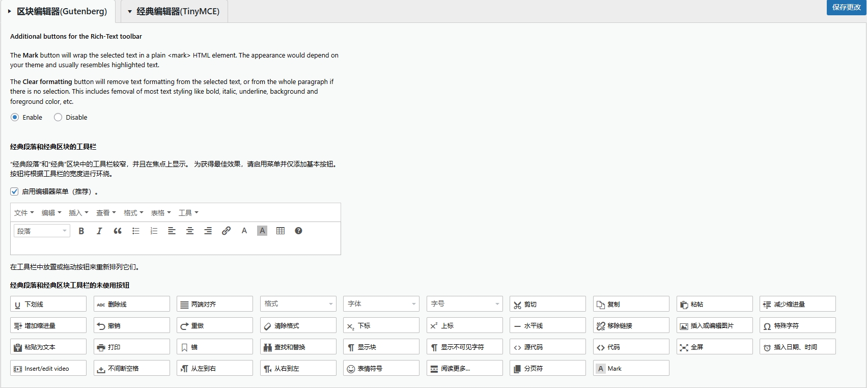 扩展并增强了区块编辑器(Gutenberg)和经典编辑器(TinyMCE)。该插件增加了编辑器的更多功能,但是会占用内容,一般情况下用处不是很大。若对接第三方公司,需要更换到经典编辑器时可使用,前端编辑起来更直观。