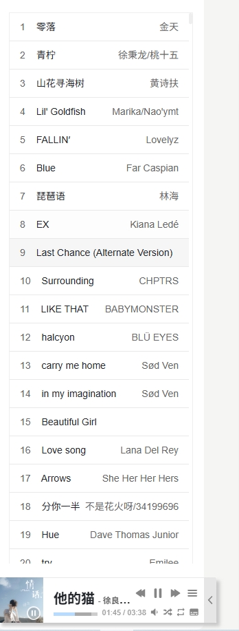 以上代码便是增加了一个mini音乐播放器,并且解析音乐的服务为netease,歌单ID为540470546(主包找了好久的差不多一千首音乐的歌单,什么风格都有)。若想更改更多参数,可自行按照播放器的代码进行修改: