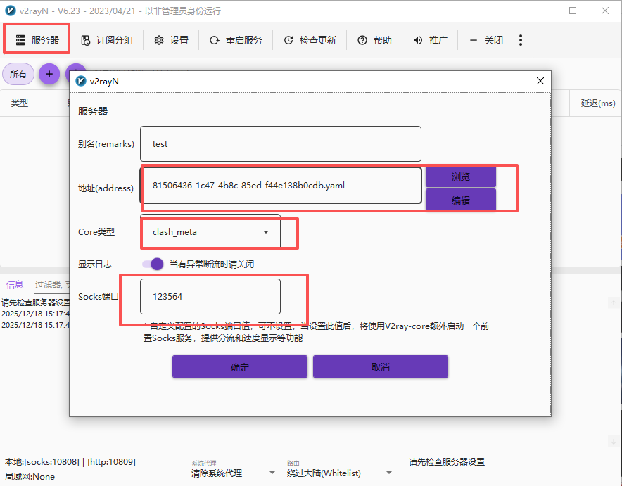 直接下载转换好的节点文件,打开V2rayN软件,添加自定义服务器并上传下载好的节点文件,注意core类型要选择clash.meta,端口自定义(不为0即可)